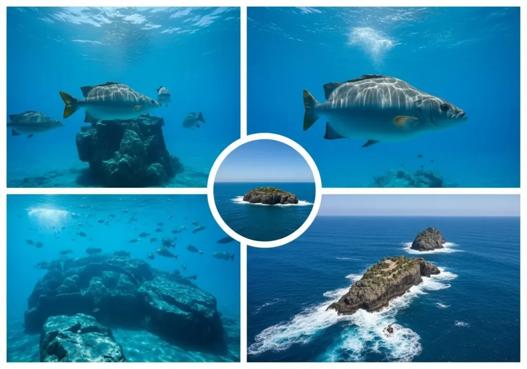 The ecosystem is brought to life by thousands of other fish. Huge schools of Giant Trevally and Bigeye Trevally shimmer as they move in unison, while colorful snappers and groupers add splashes of color to the vibrant underwater landscape.